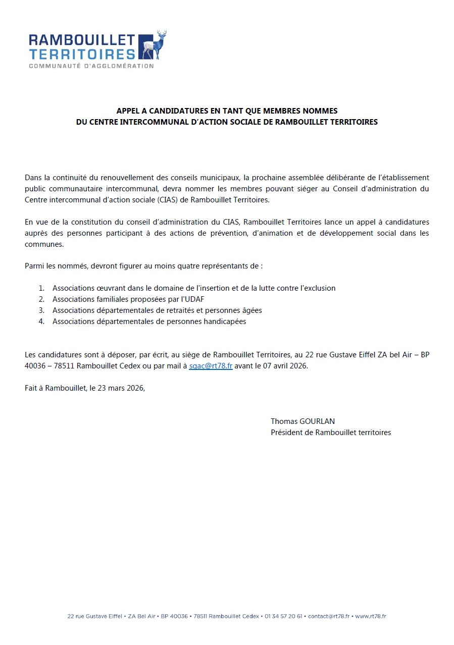 En vue de la constitution du conseil d’administration du CIAS, Rambouillet Territoires lance un appel à candidatures auprès des personnes participant à des actions de prévention, d’animation et de développement social dans les communes.